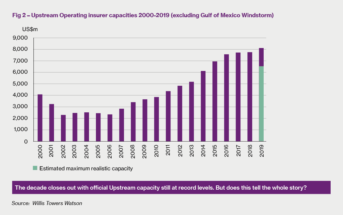 Another increase…and no withdrawals As many readers will undoubtedly be aware, the history of the Upstream market in the 21st century has been dominated by the extraordinary increase in overall underwriting capacity levels. Since the immediate aftermath of the tragic events of 9/11 – and a minor blip following the hurricanes of 2005 - the market capacity trajectory has been remorselessly upward. Although the rate of increase has tailed off somewhat in recent years, there has been no sign of any decrease in capacity, nor indeed of any significant underwriter withdrawals from this class.
