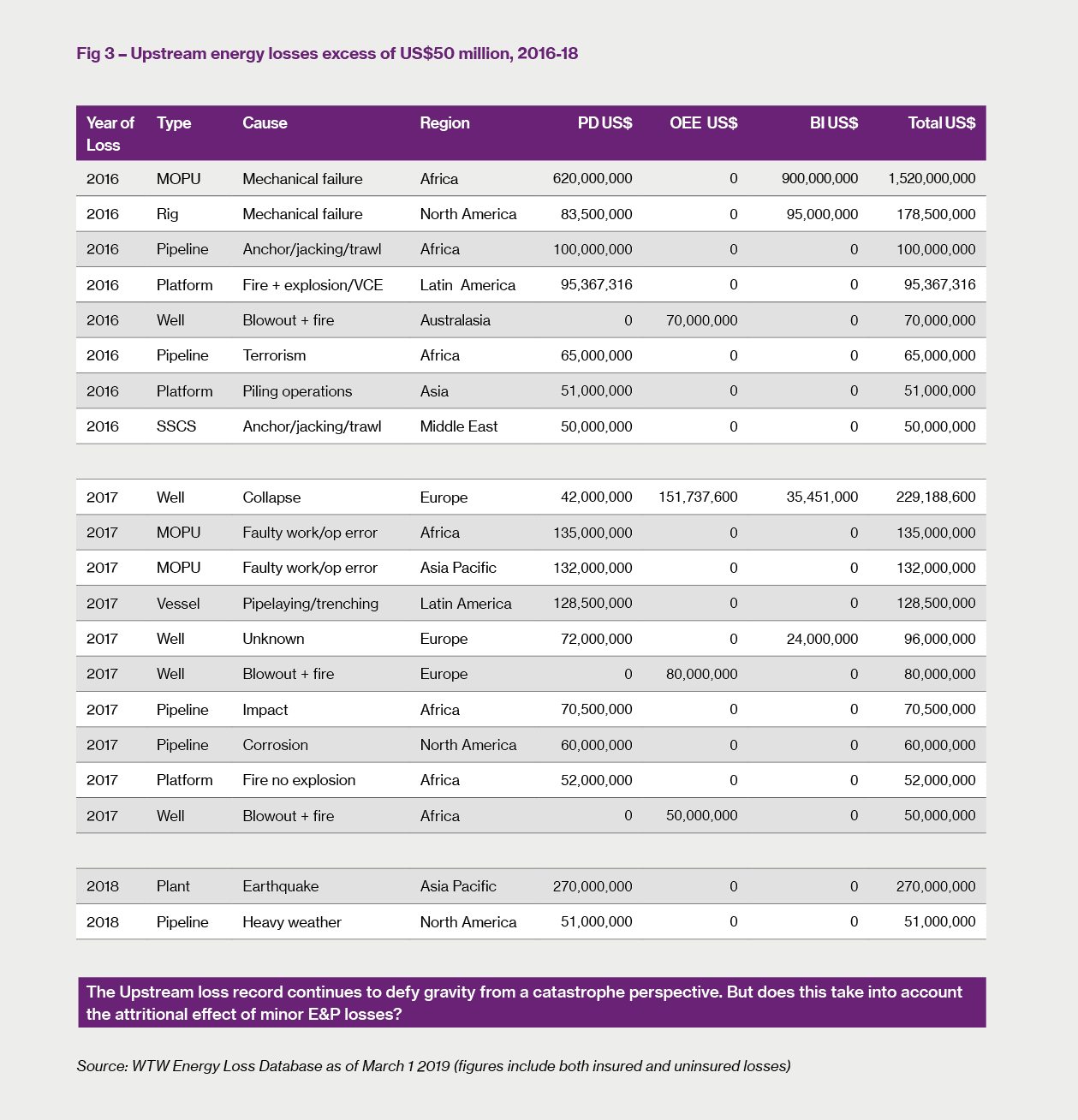 Favourable loss record enters its third year From a catastrophic loss perspective, there is no doubt that the Upstream market continues to benefit from a remarkable run free of major disasters. Indeed, Figure 3 shows that the last three years have produced only one major disaster of note, being a significant loss offshore West Africa in 2016 that unusually involved a large Loss of Production Income loss. Aside from this, the record has really been extremely favourable from an underwriting perspective; indeed, so far in 2018 our database has only recorded two losses in excess of US$50 million. Even if further losses that have been incurred last year but have yet to find their way onto our database are taken into account, there is very little chance of them making any significant difference to the overall benign scenario.