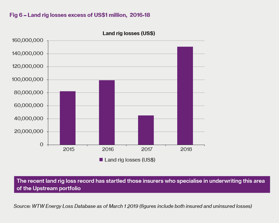Land rigs: a blot on the Upstream risk landscape In many ways, land rigs are something of an anomaly in the Upstream market. By definition they operate onshore; their values are small by Upstream asset level standards; losses tend to be low level and frequent rather than high level and catastrophic. But they have always been an integral part of the Upstream portfolio and several Upstream leaders have taken a long term view that, written in bulk and under insurer facilities, money can be made over time. However, Figure 6 shows that 2018 has been a particularly bad year for land rig losses, with nearly US$150 million dollars’ worth of losses excess of US$1 million reported to our database to date. It is our understanding that the recent upturn in E&P activity has increased utilisation rates, especially in the US, which may well account for this recent upsurge in loss activity.