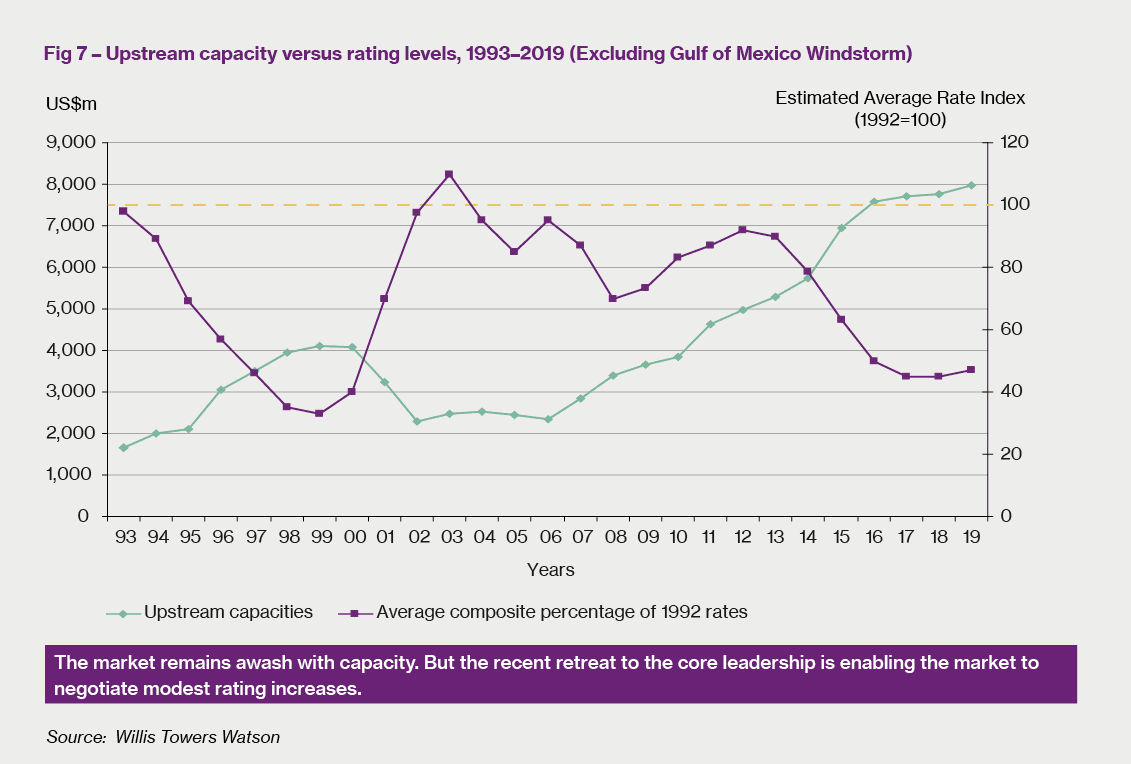 So what can buyers expect from the Upstream market as we head further into 2019? Our chart outlined in Figure 7 shows the correlation (or sometime lack of correlation) between official underwriting capacity and average rating levels over 26 years since we began keeping the data. In very general terms it shows that as underwriting capacity has significantly increased since 2006 to its present record high, prices have generally reduced, following the economic laws of supply and demand.