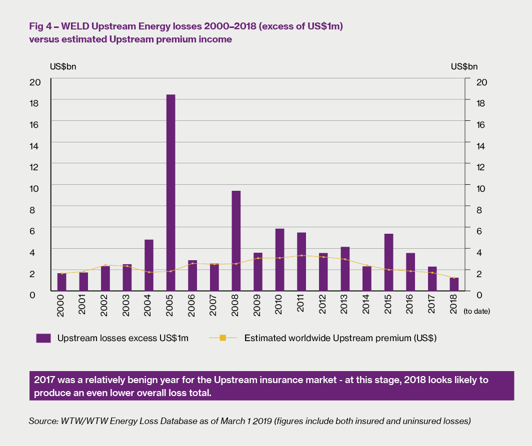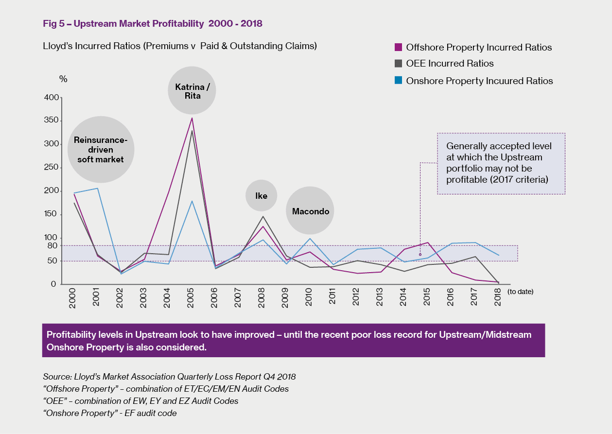 The return of the “false equilibrium” But now, once again as in the period 2008-14, we are seeing the recurrence of the phenomenon known as the “false equilibrium” – increasing prices at a time of increasing underwriting capacity. Having flattened out in 2017, the gentle market hardening is defying the laws of gravity once more. The last time this occurred was when a series of underwriting losses, beginning with hurricane Ike in 2008 and continuing during the next few years with major losses such as the Deepwater Horizon tragedy in 2010 and the Gryphon A loss in 2011, coincided with a period of a limited number of Upstream leaders. Now we are seeing the same thing again, but this time the pretext is more general – the new underwriting mood in London has been prompted by the need for underwriting discipline across the board as the Lloyd’s Decile 10 initiative makes its impact felt across Upstream just as much as any other line of business. With leading underwriters under such public scrutiny, and with realistic alternatives few and far between, it is hardly surprising that a combination of insurer management and the Lloyd’s PMD has been able to prevent any rating reductions being applied to almost every programme4. Of course there are exceptions and there is no doubt that by restructuring programmes and by persuading insurers to take into account additional premium income coming into the market, there will be some programmes that will defy the market norm. But in our view they will be few and far between.