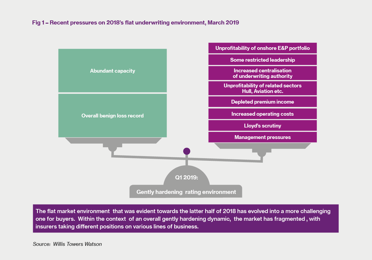 A gentle acceleration of the hardening dynamicTowards the end of last year we released a supplement to our 2018 Review1 in which we described conditions in the Upstream insurance market as basically flat. We explained that the continued presence of abundant capacity, together with an essentially benign loss record, was being balanced by the drive for underwriting profitability, especially in Lloyd’s, following poor overall underwriting results in other classes. However, nothing stands still for long in the Energy insurance markets and we can now sense a small but noticeable change in the overall underwriting environment in the Upstream sector. Despite all the macro factors – capacity, losses, overall underwriting profitability - still pointing to favourable market conditions, we must instead report that the market has, almost imperceptibly, moved closer towards a harder trading environment for buyers.