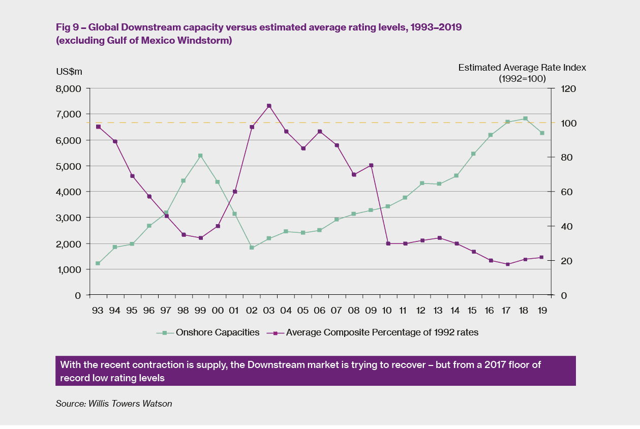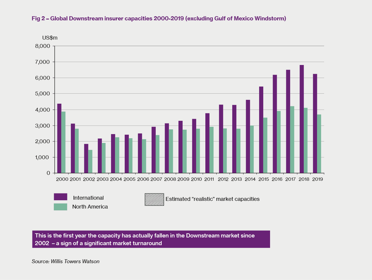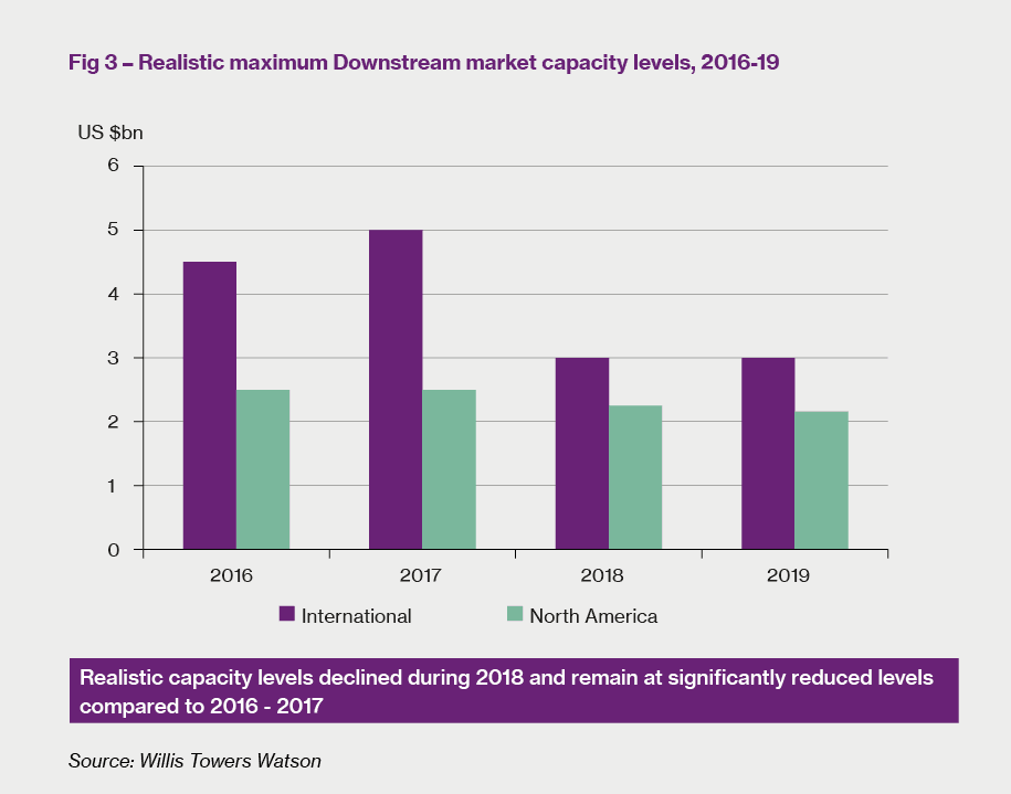 A glance at our Downstream capacity chart for 2019 (Figure 2) shows why conditions have become so challenging in this market. For the first time since 2002, in the immediate aftermath of the 9/11 tragedy, overall theoretical underwriting capacity (as provided to us by the market) is actually down – to just over US$6 billion for International business and just under US$4 billion for US business.