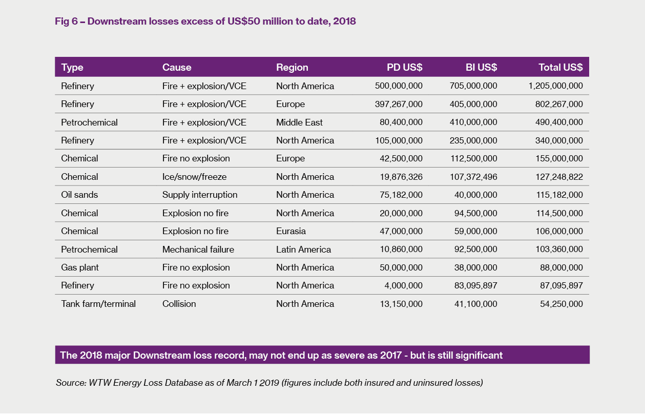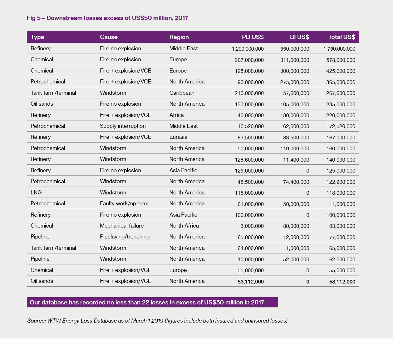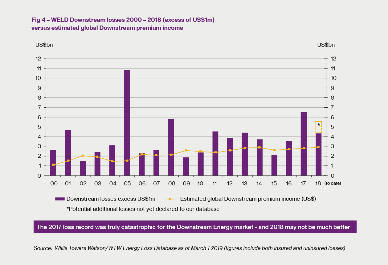 A dreadful 2017 – and 2018 isn’t looking great either As can be seen from Figure 4, the 2017 Downstream loss record has been dreadful – the worst non-hurricane affected year since the turn of the century. It seems that 2018 will be a little better, but not much – at this stage we do not believe that all the losses occurring in 2018 have made their way onto our database, which is why we indicate a contingency for an additional US$1 billion of losses for last year. In any event, the 2018 loss total has already once again exceeded our estimate of the total global premium income for this class.