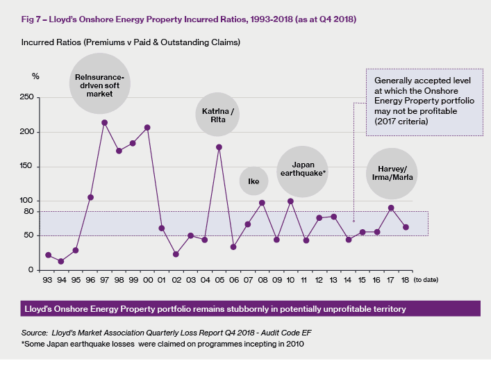Figure 7 overleaf shows only Lloyd’s figures, but there can be no doubt that the recent Incurred Ratios (premium income versus paid and outstanding losses) displayed in this chart are not only indicative of this class across the board, but may have also been exceeded by insurance company results elsewhere. 2017’s Incurred Ratio of 90+% has now been followed by 2018’s 60%, a figure which also signals another underwriting loss for the Lloyd’s Downstream portfolio.