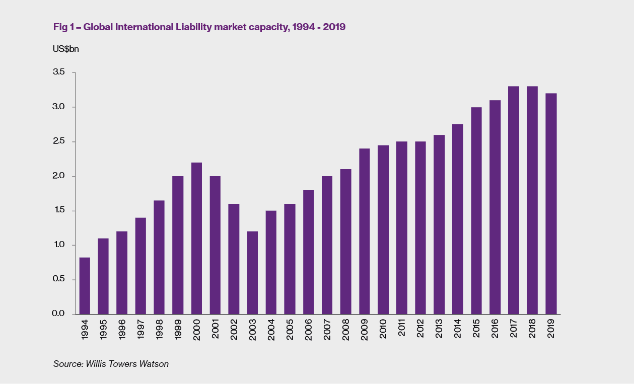 This is a particularly fitting analogy for the current state of the Liability market: superficially all is calm (as per Figure 1) - global Liability market capacity remains virtually unchanged at US$3.2 bn and there were no dramatic changes to treaty reinsurance costs at Q1 2019.