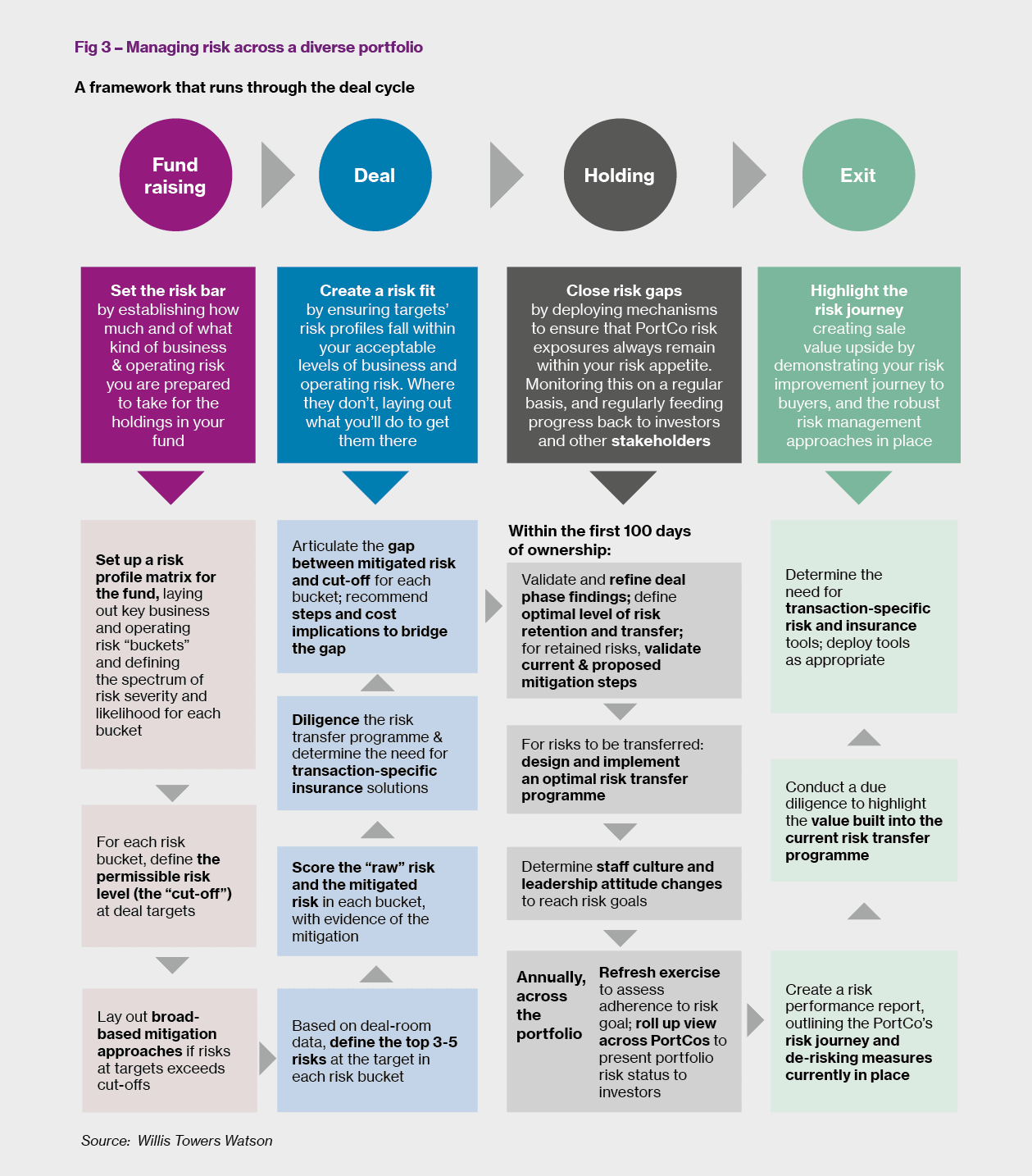 Taking a leaf out of the financial risk management process What should the PE industry do to look at operating risk differently? To find the answer, the industry doesn’t need to look very far beyond the way it manages financial risk. Risks to achieving Internal Rate of Return (IRR) targets, risks of breaching debt covenants, risks of being able to meet interest coverage ratios – these are identified and planned for, measured using a consistent set of indicators, revisited with regularity, and reviewed holistically across the portfolio. Material movement on these risk measures are reported to investors, successes in meeting milestones are publicised, and failures investigated. In short, financial risks are managed across the deal cycle, from fundraising to exit. A similar fundraising-to-exit approach to operating risk would encompass four characteristics, as outlined in Figure 3 on the following page: