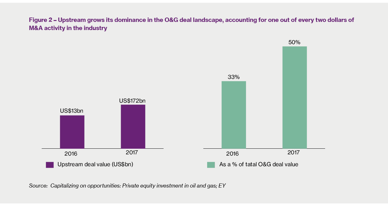 The Upstream sector has benefitted the most from this trend. Deal values climbed 30% over the previous year to US$172bn in 2017, representing 50% of global O&G deal activity, up from 33% in 2016.