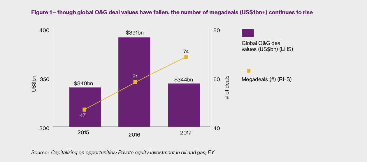 It is no wonder, then, that deal activity in O&G globally continues to remain healthy. Although global deals are down in 2017 from the prior year when measured by both volume and value, a flight to quality is beginning to emerge. The number of megadeals has continued to increase every year since 2014. 47 assets valued at greater than US$1bn changed hands in 2015. By 2017, this had increased to 74 assets1.